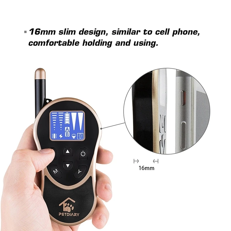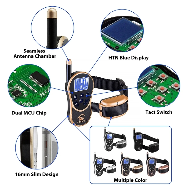 2. Training model options : Led light flashing + Tone + Vibrating + Static . 8 levels of adjustable static and vibration for your customerized needs , using a tone Mode which will give an audible warning . LCD display is with blue backlit design for Day and Night operating .